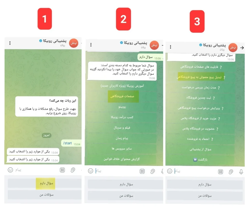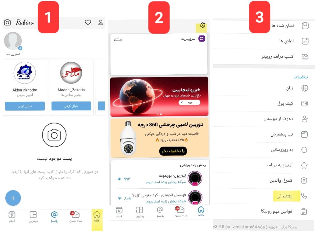وارد بخش «خانه» بشید و روی آیکون تنظیمات بزنید. به پایین اسکرول کنید و «پشتیبانی» را انتخاب کنید و روی «بات پشتیبانی روبیکا» بزنید.